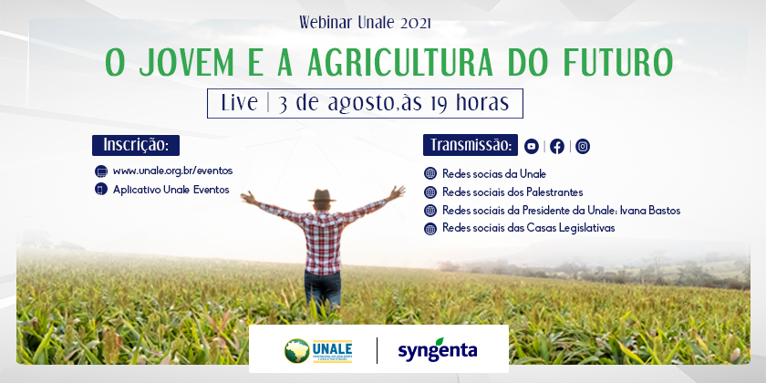 Na próxima terça-feira, 03 de agosto, às 19h, as plataformas digitais serão palco de um grande debate sobre a permanência do jovem no campo e o futuro da agricultura brasileira, em mais um evento promovido pela União Nacional dos Legisladores e Legislativos Estaduais (Unale), por meio da Secretaria de Agricultura da entidade, em parceria com a Syngenta.