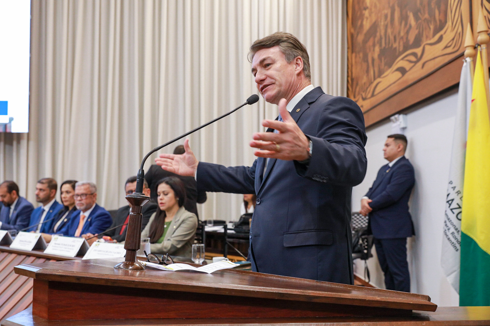 Em seu discurso de posse, o deputado Afonso Fernandes destacou a atuação do Parlamento Amazônico para o desenvolvimento dos estados que integram a região amazônica. “Assumo esta responsabilidade como uma missão de defesa da nossa região e do povo amazônico. O Parlamento Amazônico é um instrumento de união. União das nossas Assembleias Legislativas, das nossas ideias e das nossas forças. Precisamos defender uma agenda que trate de infraestrutura, integração logística, ampliação de ramais, segurança jurídica, regularização fundiária e do fortalecimento da indústria regional e, sobretudo, de um desenvolvimento sustentável que concilie produção, preservação e justiça social. A região Norte precisa ser protagonista das decisões que impactam o nosso futuro”, afirmou.
